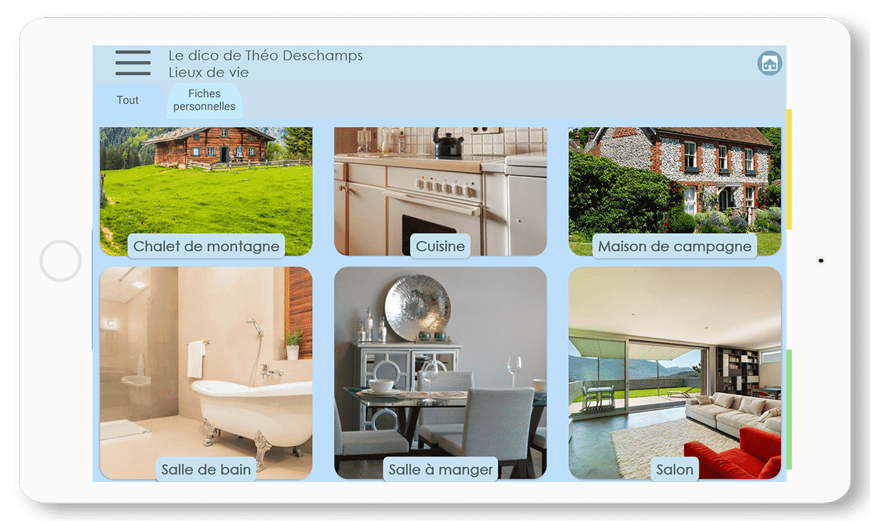 L’ application My Dico, est un outil très utile dans les cas de troubles de l’autisme. Cette application innovante fournit une banque d’images afin que le bénéficiaire puisse exprimer ses souhaits et ses besoins. Au total, l’application propose 6 catégories : Résidences, Activités, Table, Familles & Amis, Hygiène et Objets Utiles. Le dictionnaire d’images est entièrement personnalisable en sélectionnant des images préférées, ainsi qu’en permettant à l’utilisateur d’ajouter ses propres images. En outre, les images « basiques » sont ajustées en fonction de l’âge de l’utilisateur. Ainsi, un enfant se verra offrir des activités telles que « Coloriage », tandis qu’un aîné trouvera « Consulter un physiothérapeute ».